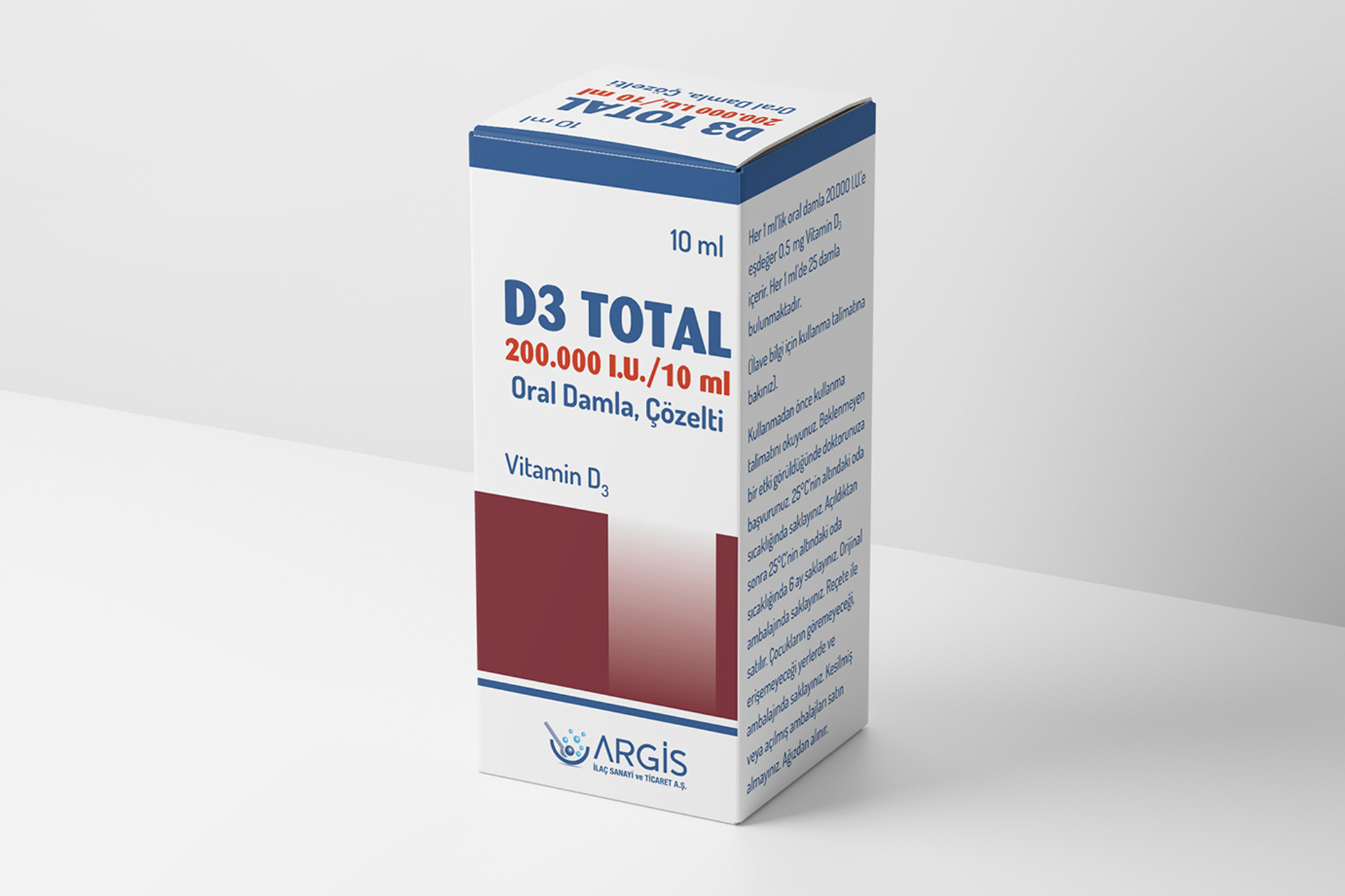 • D3 TOTAL, 10 ml çözelti içeren damlalıklı 14 ml’lik cam şişe ile karton kutularda kullanıma sunulmaktadır.